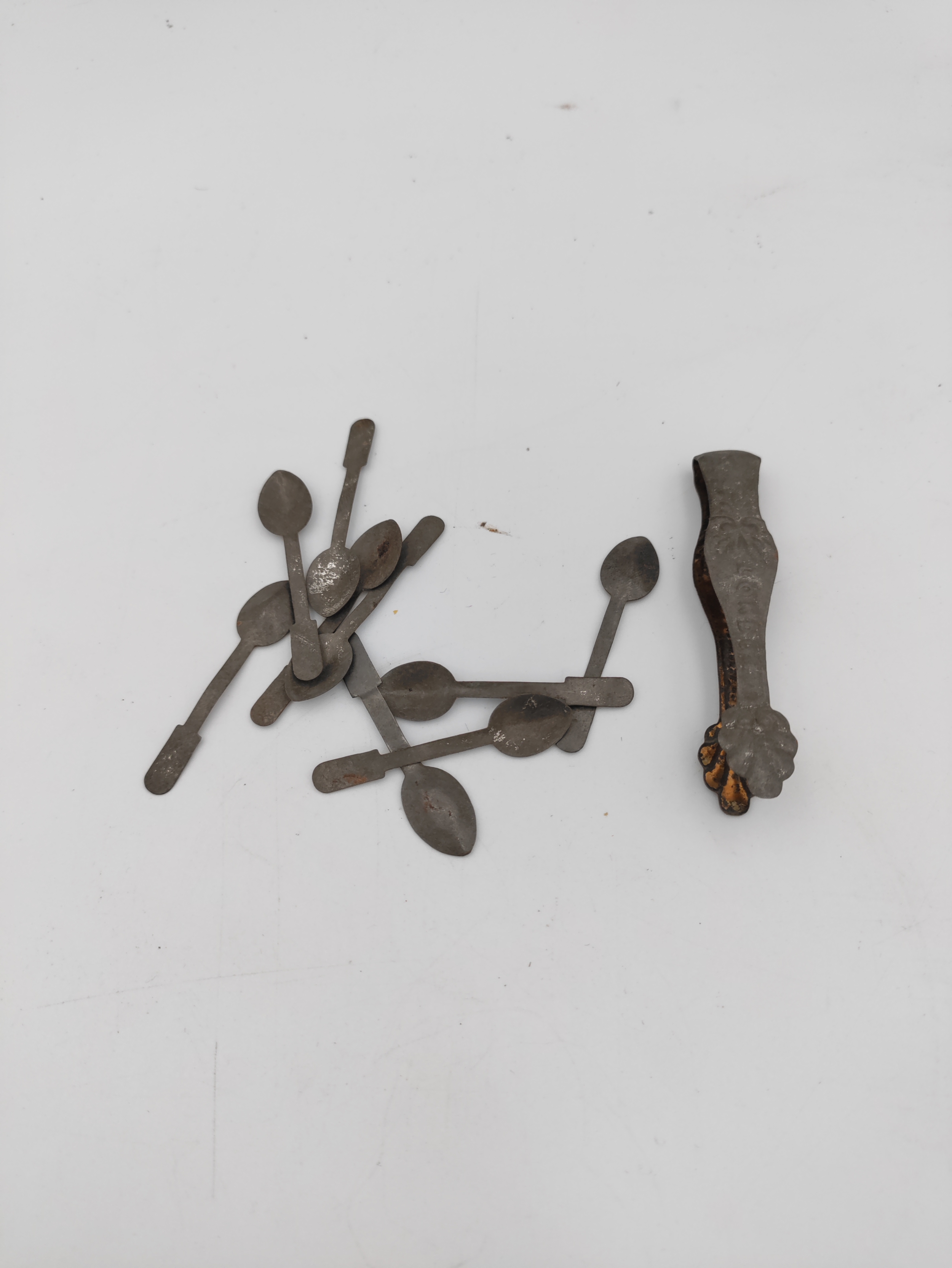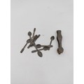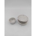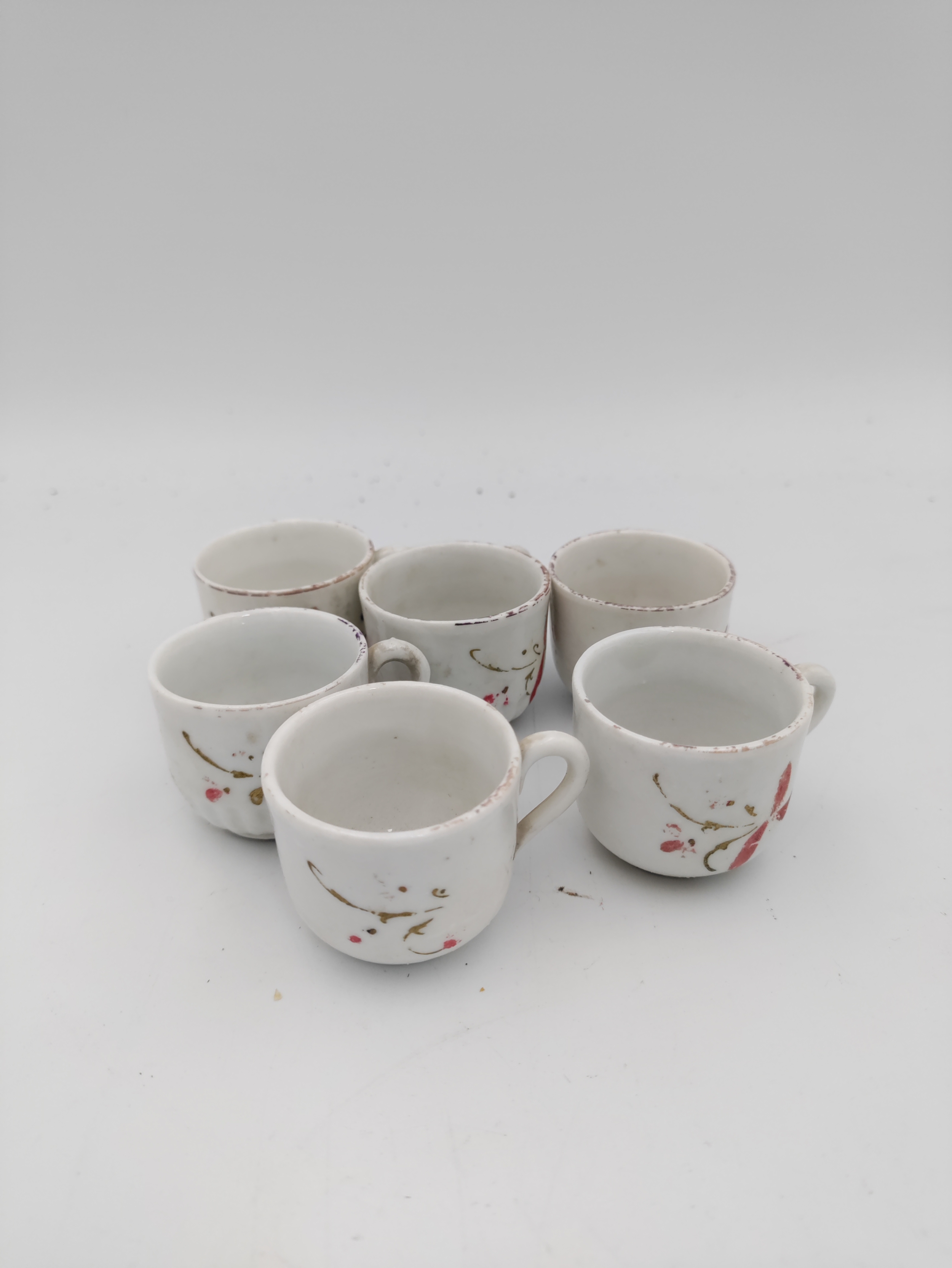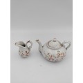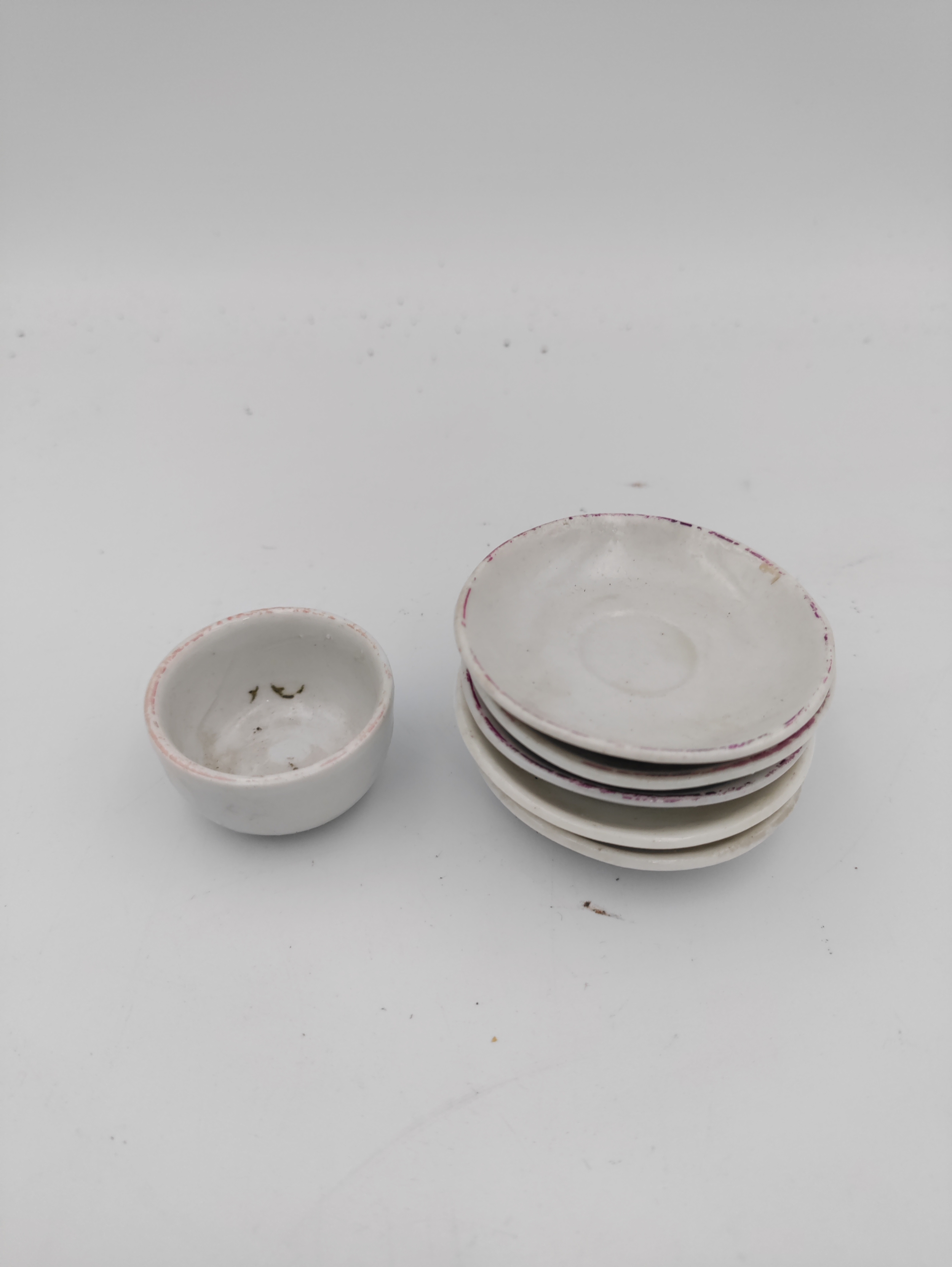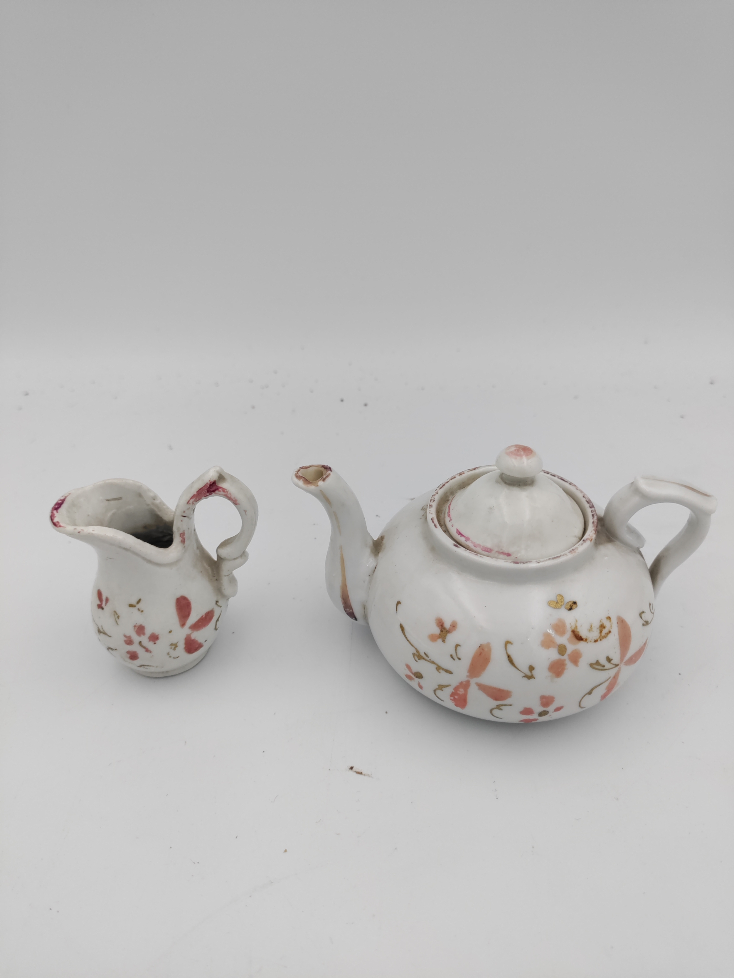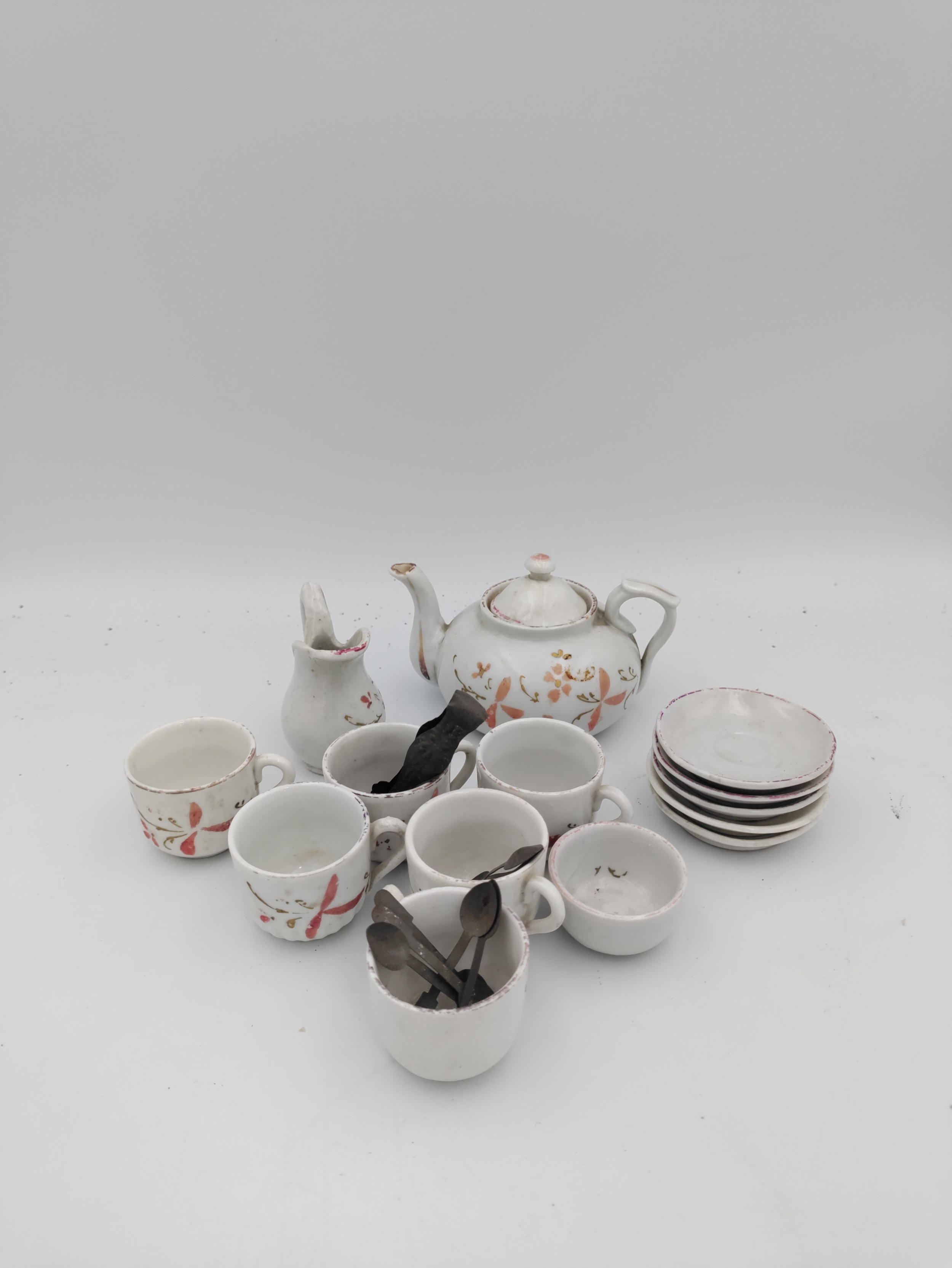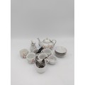 Miniature Victorian ceramic tea set with floral patterns - including miniature spoons, 6 tea cups, 1 bowl, 5 plates, and a tea pot