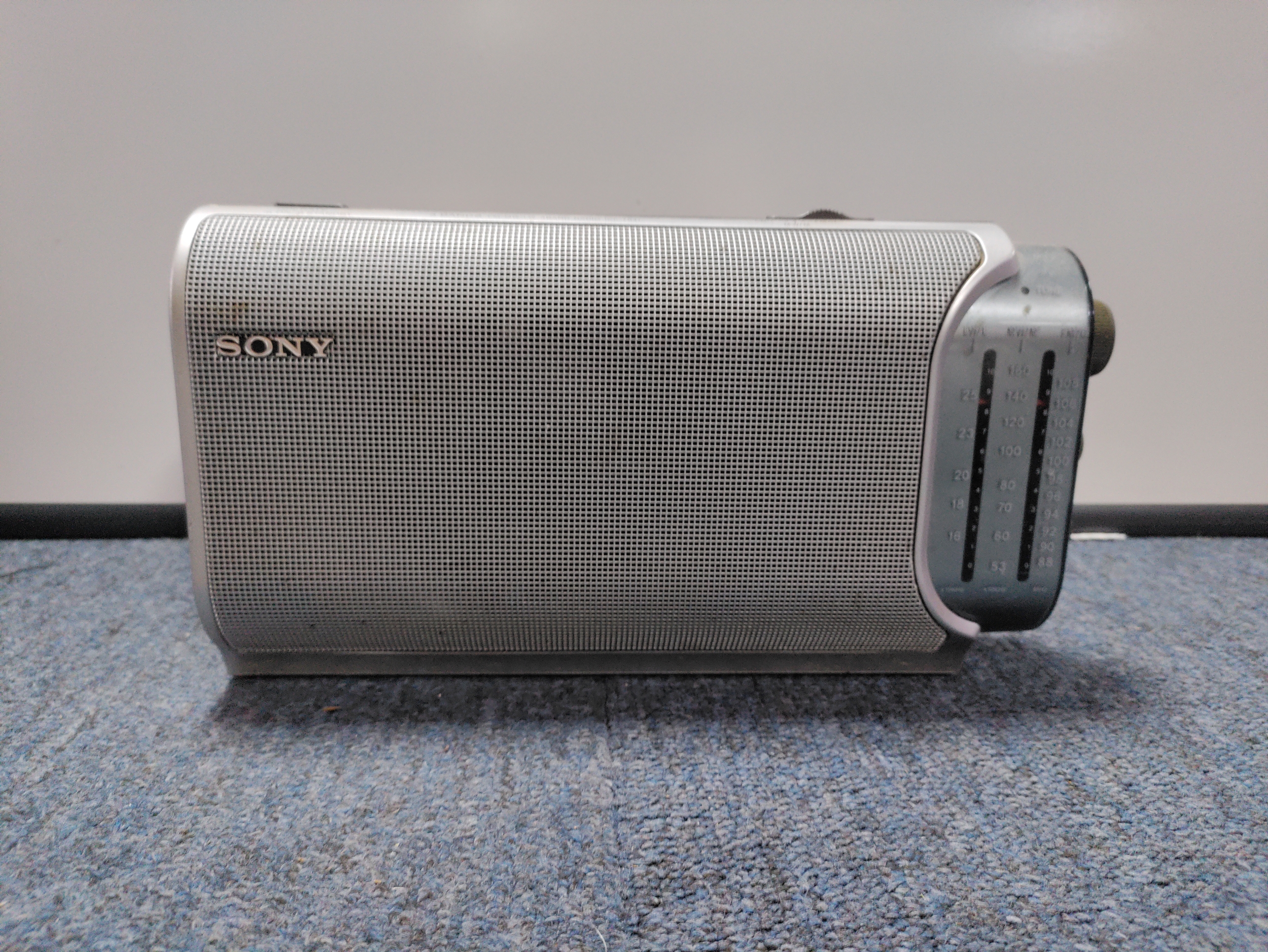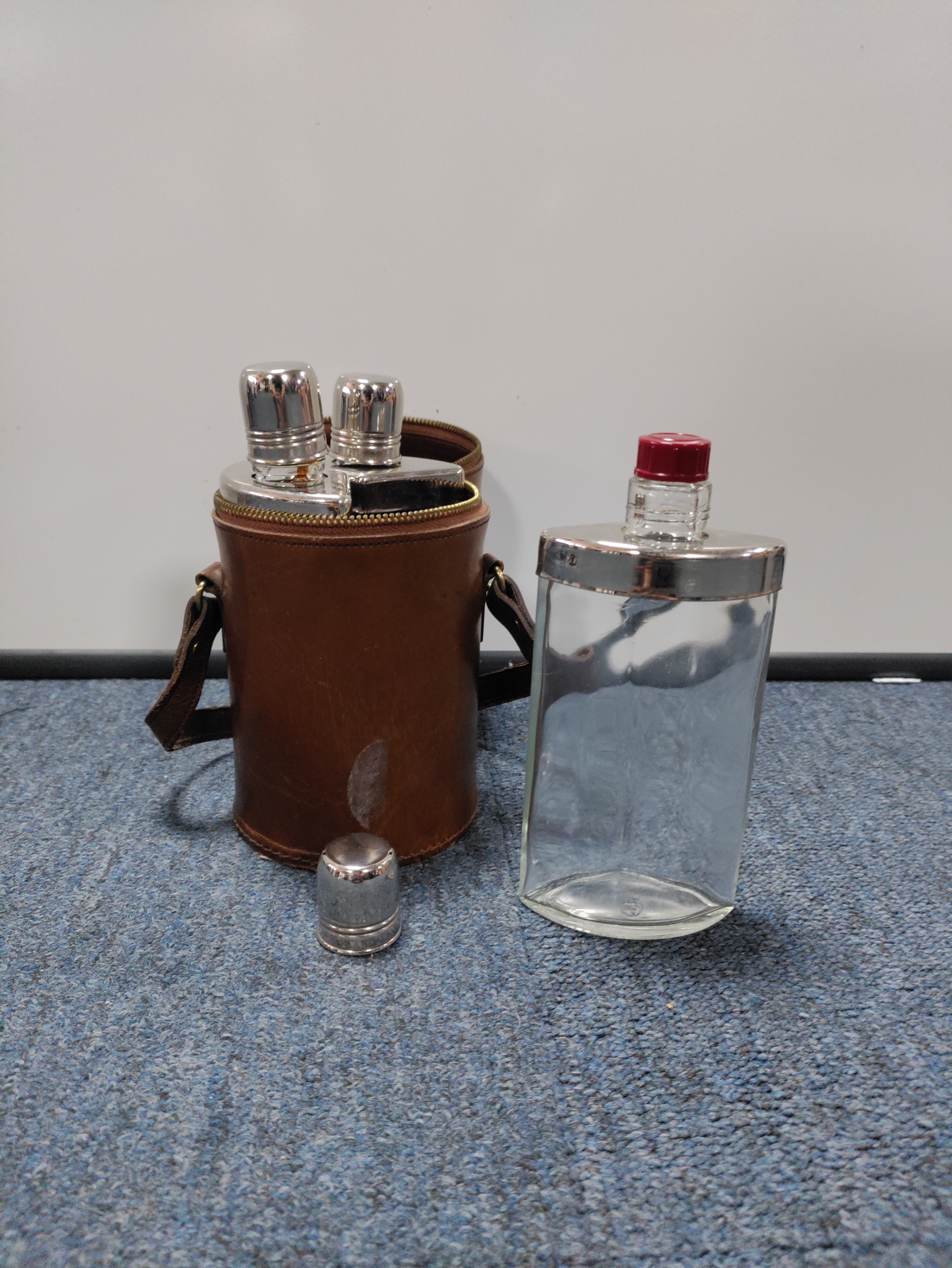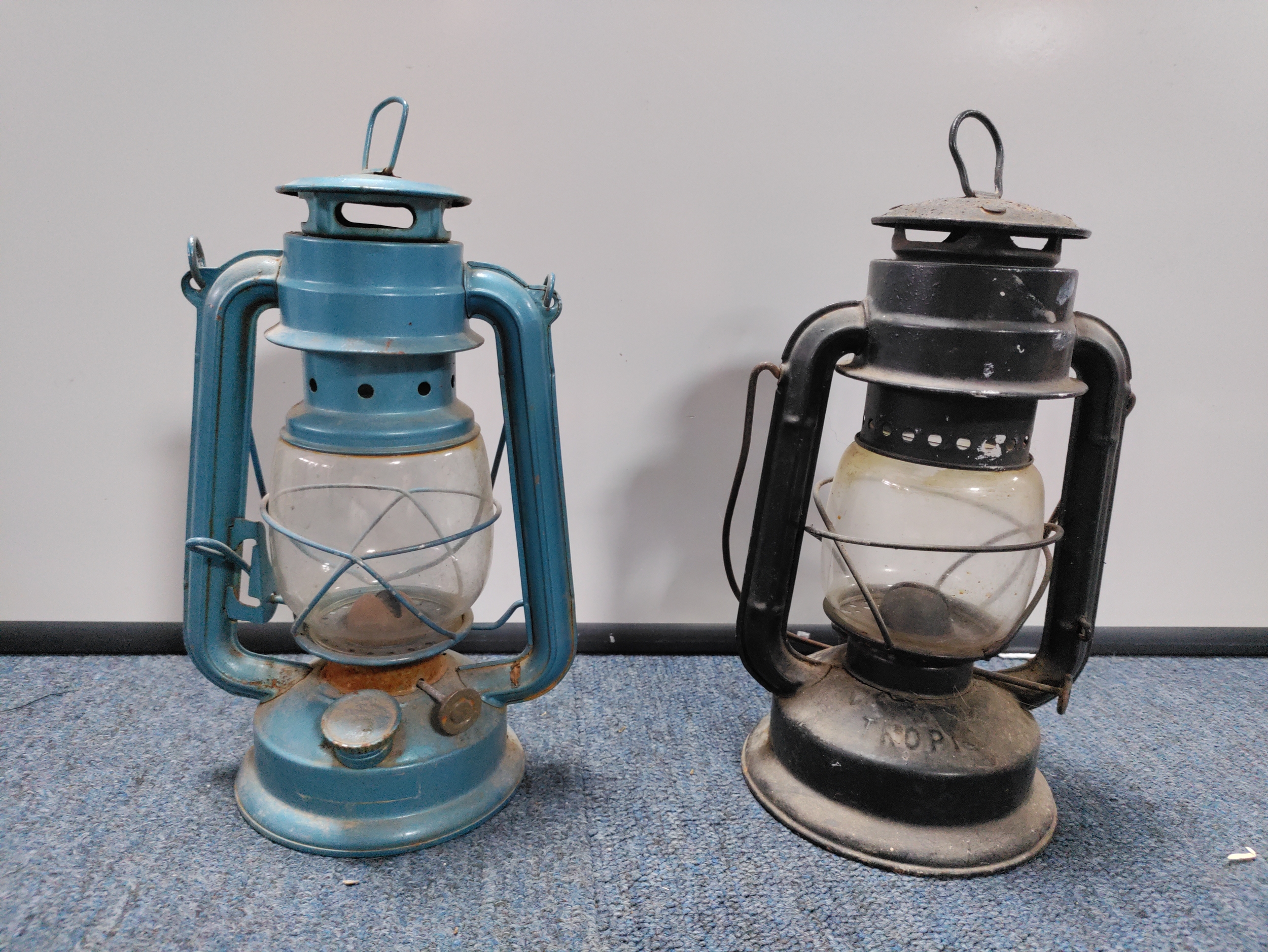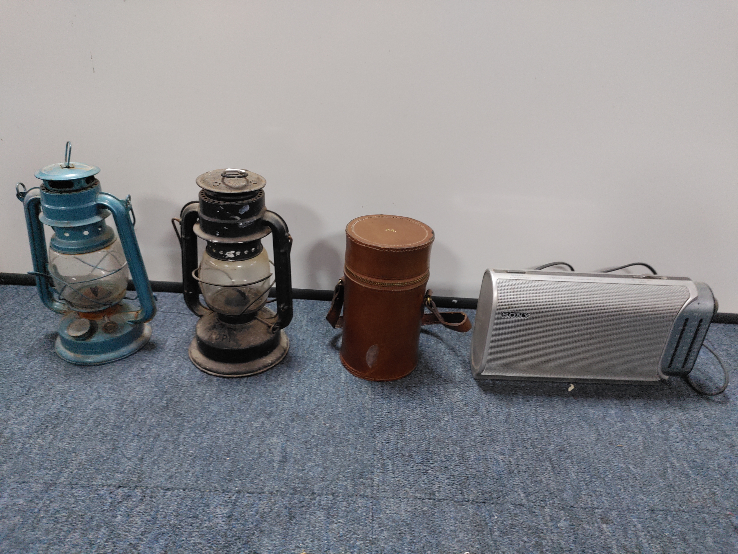 A collection of 2 Tilley paraffin lamps, A vintage real hide triple hip flask, & A Sony portable radio.
