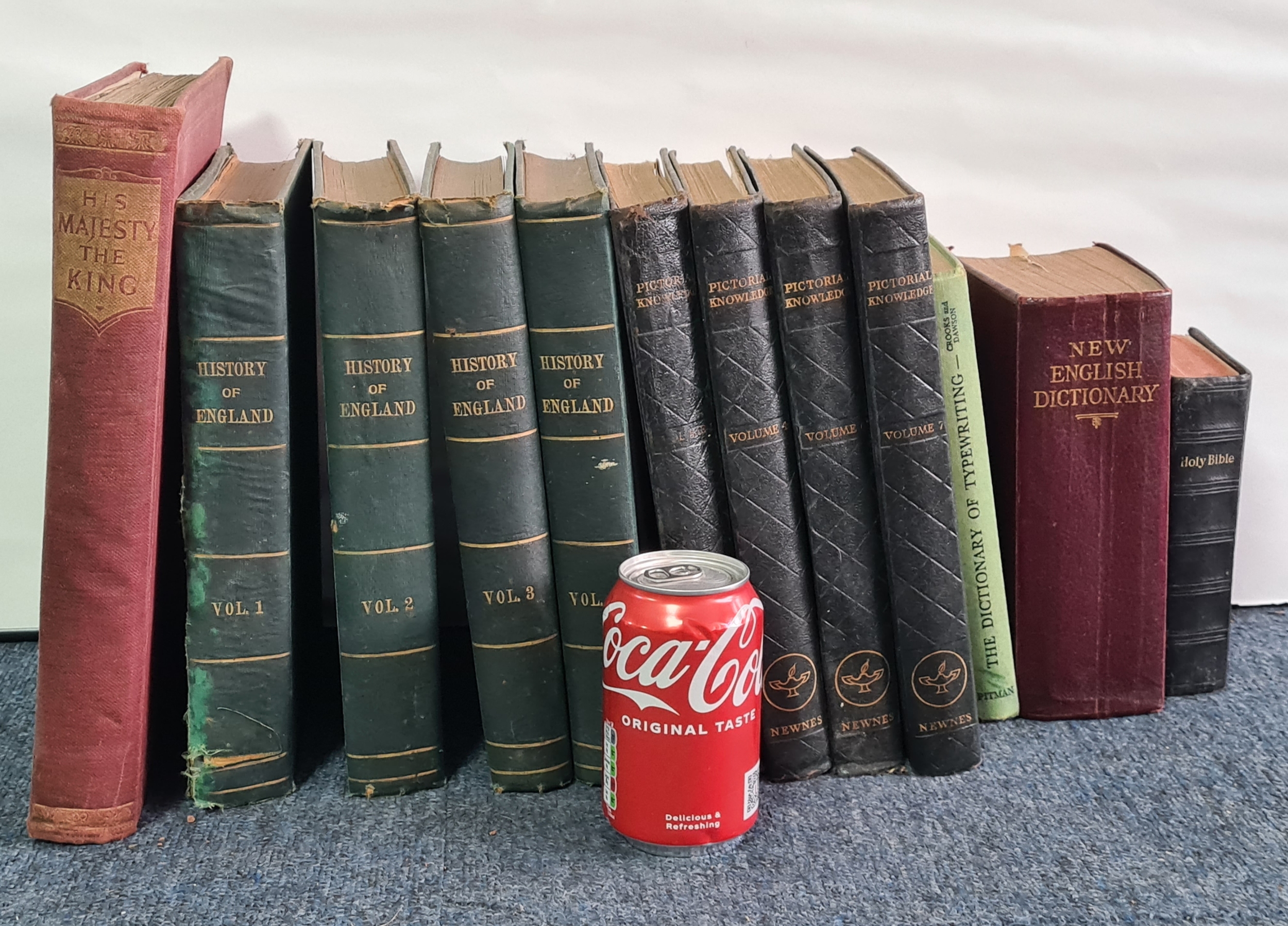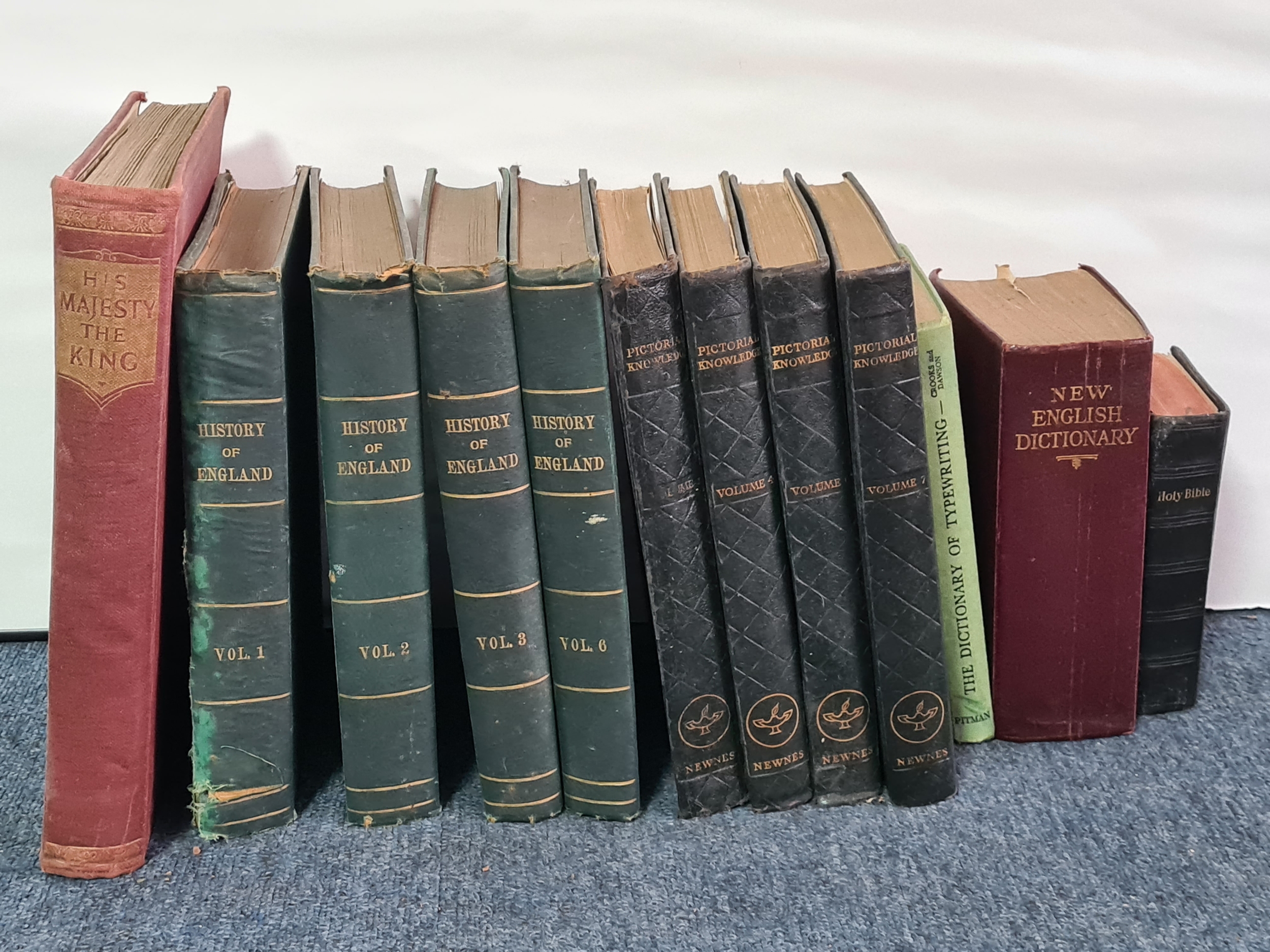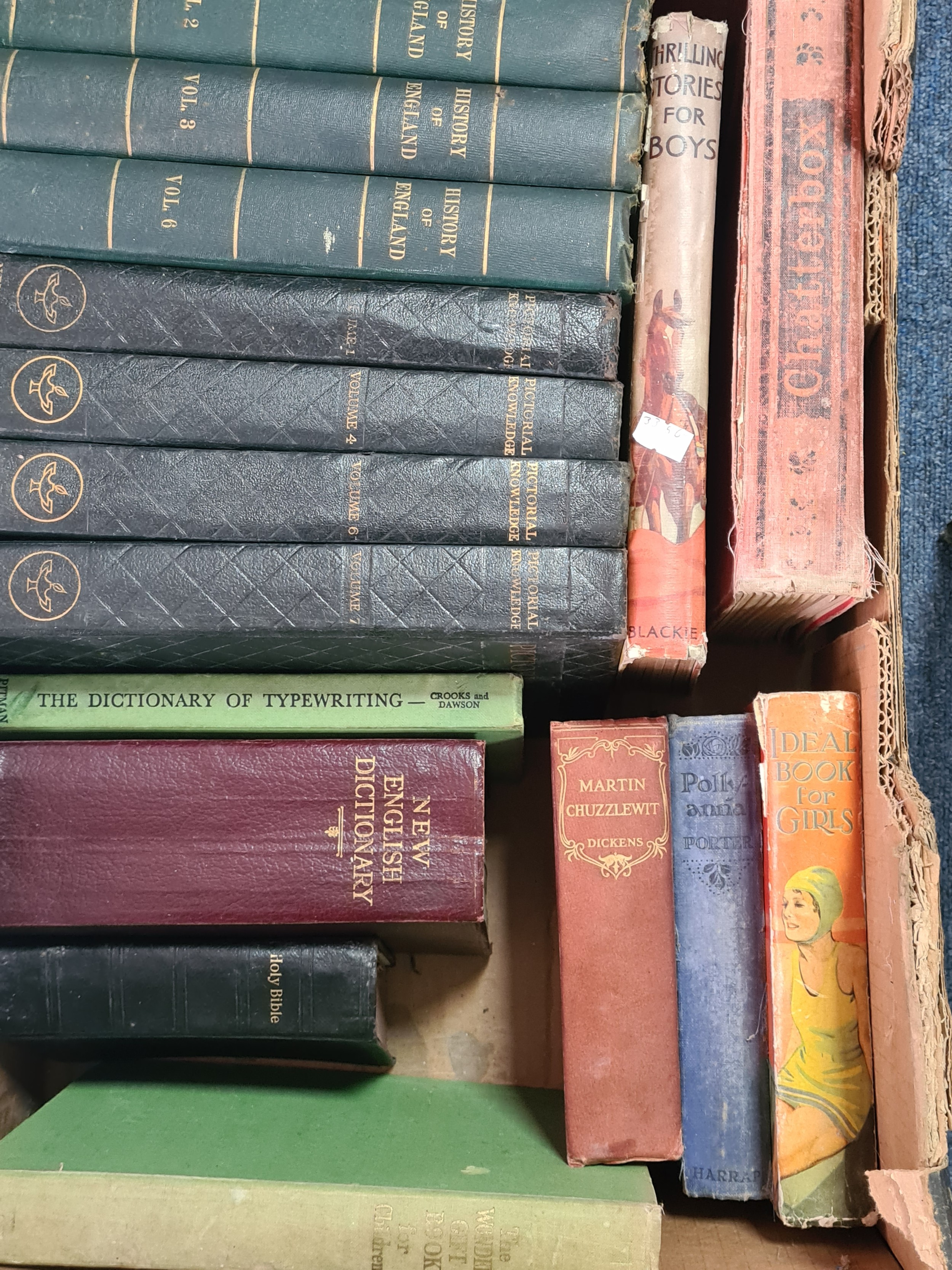 A collection of 12 vintage hard back books to include: 25 years of His Majesty King George V; History of England Vol 1,2,3 &6; Pictorial Knowledge Vol 1,4,6 &7; Dictionary of Typewriting, a Dictionary and a Bible. Also included are a few books of fiction to include Dickens.