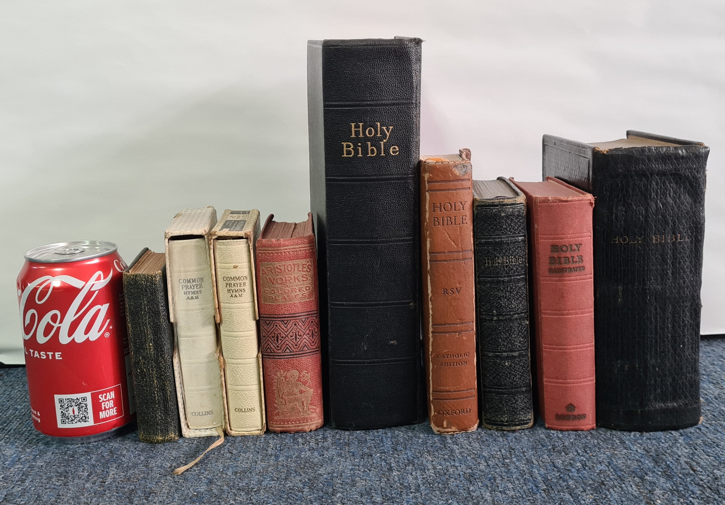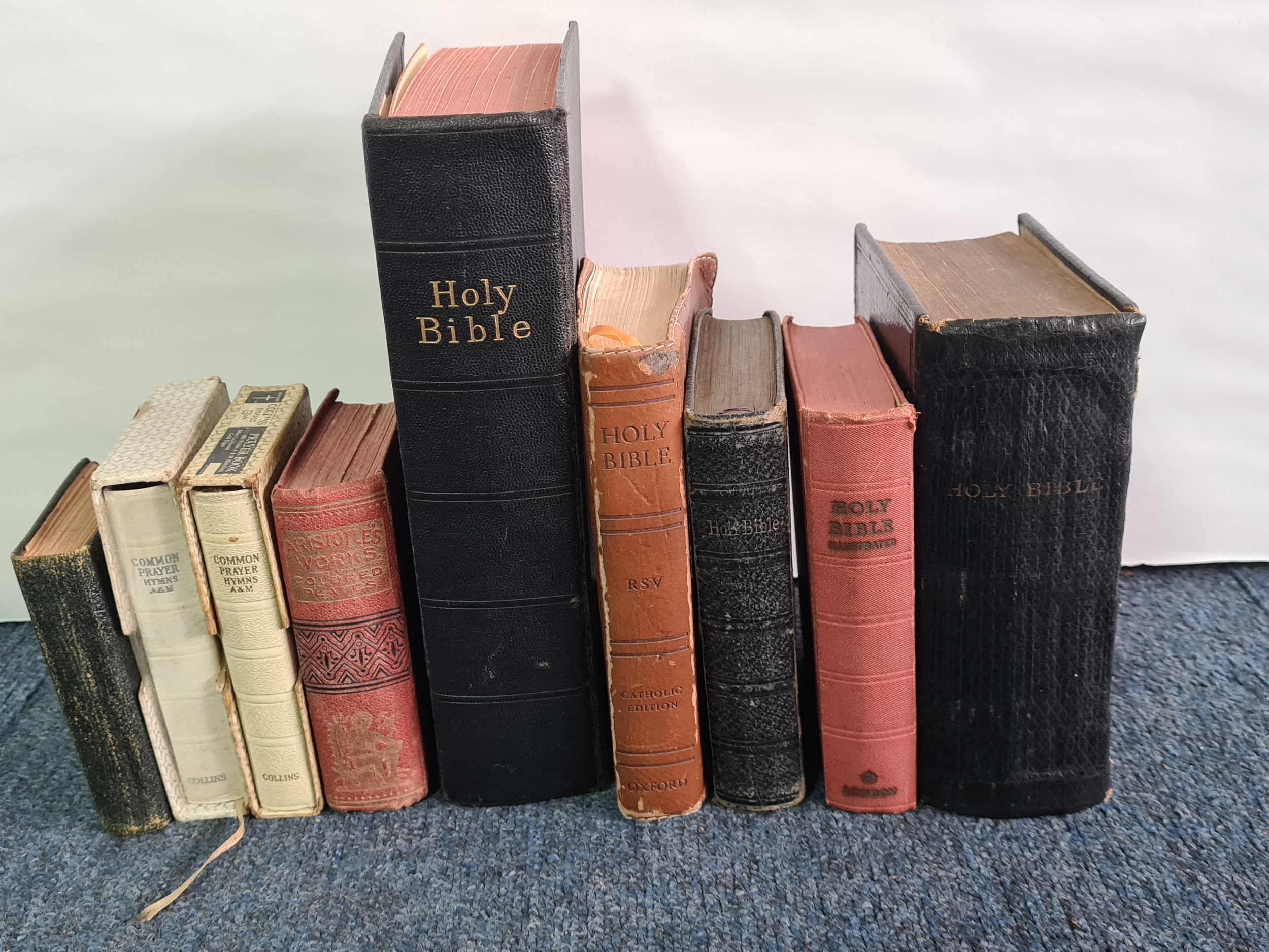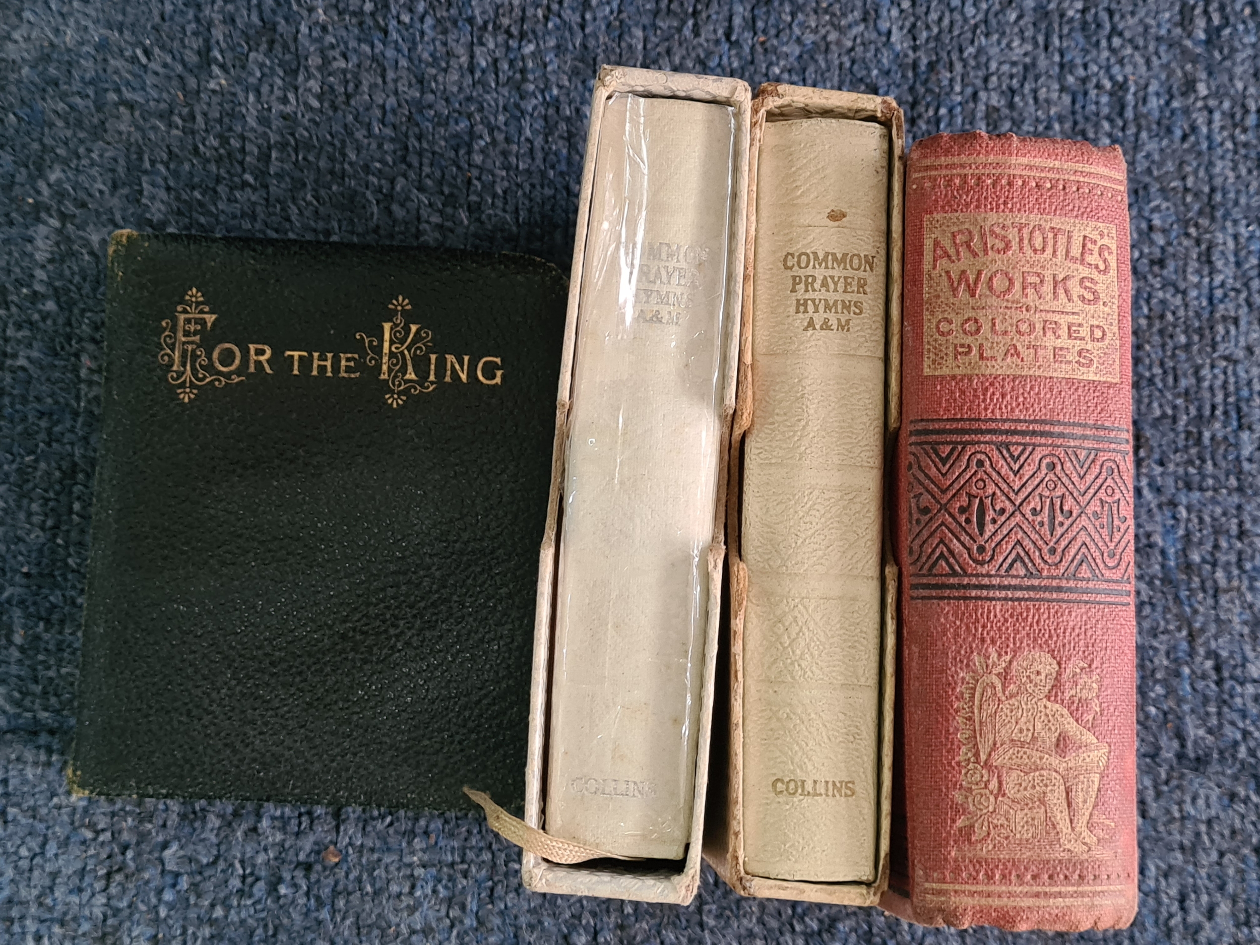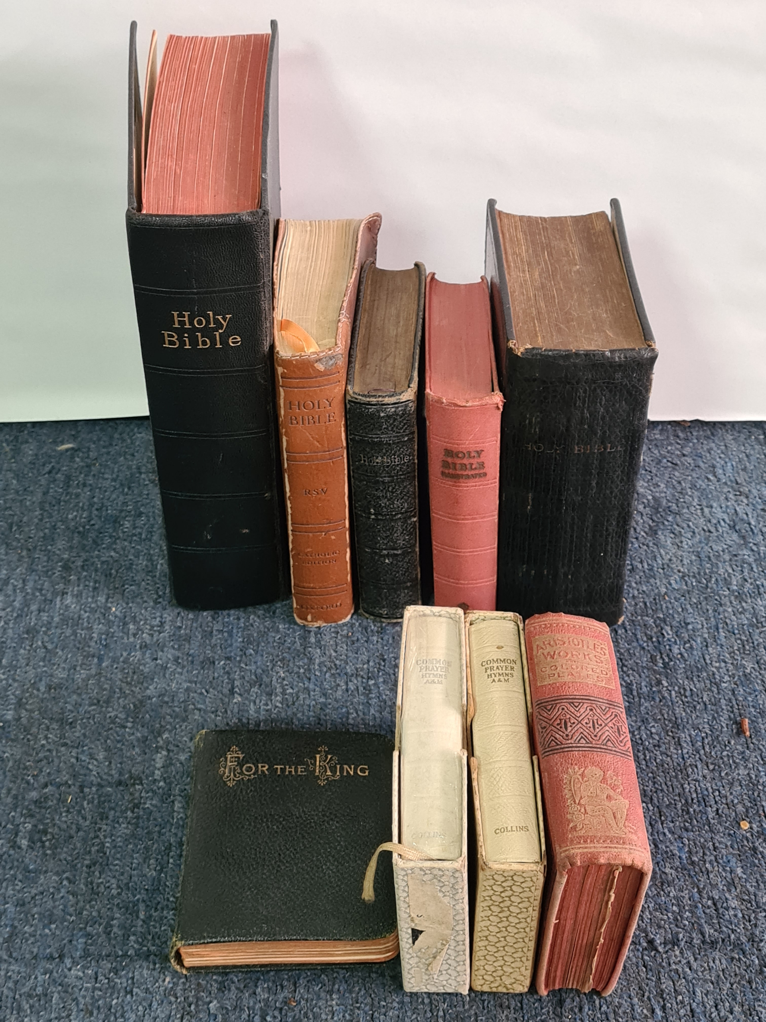 A group of vintage mainly religious books to include 5 different old Bibles, 2 books of Common Prayers, Aristotle's Works of Medical Knowledge and 'For the King' Birthday Text Book.