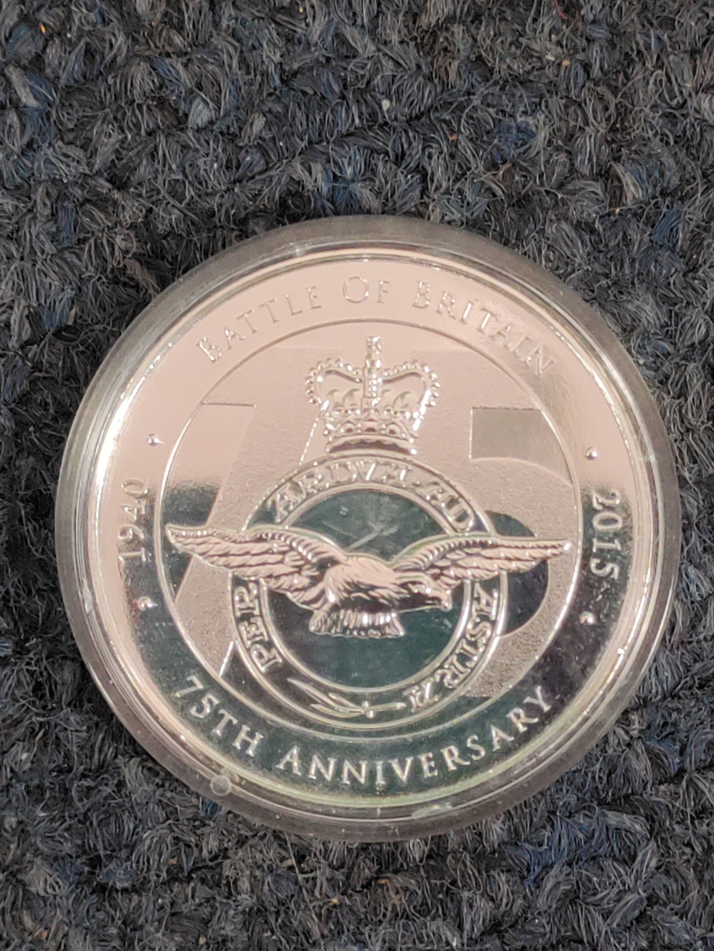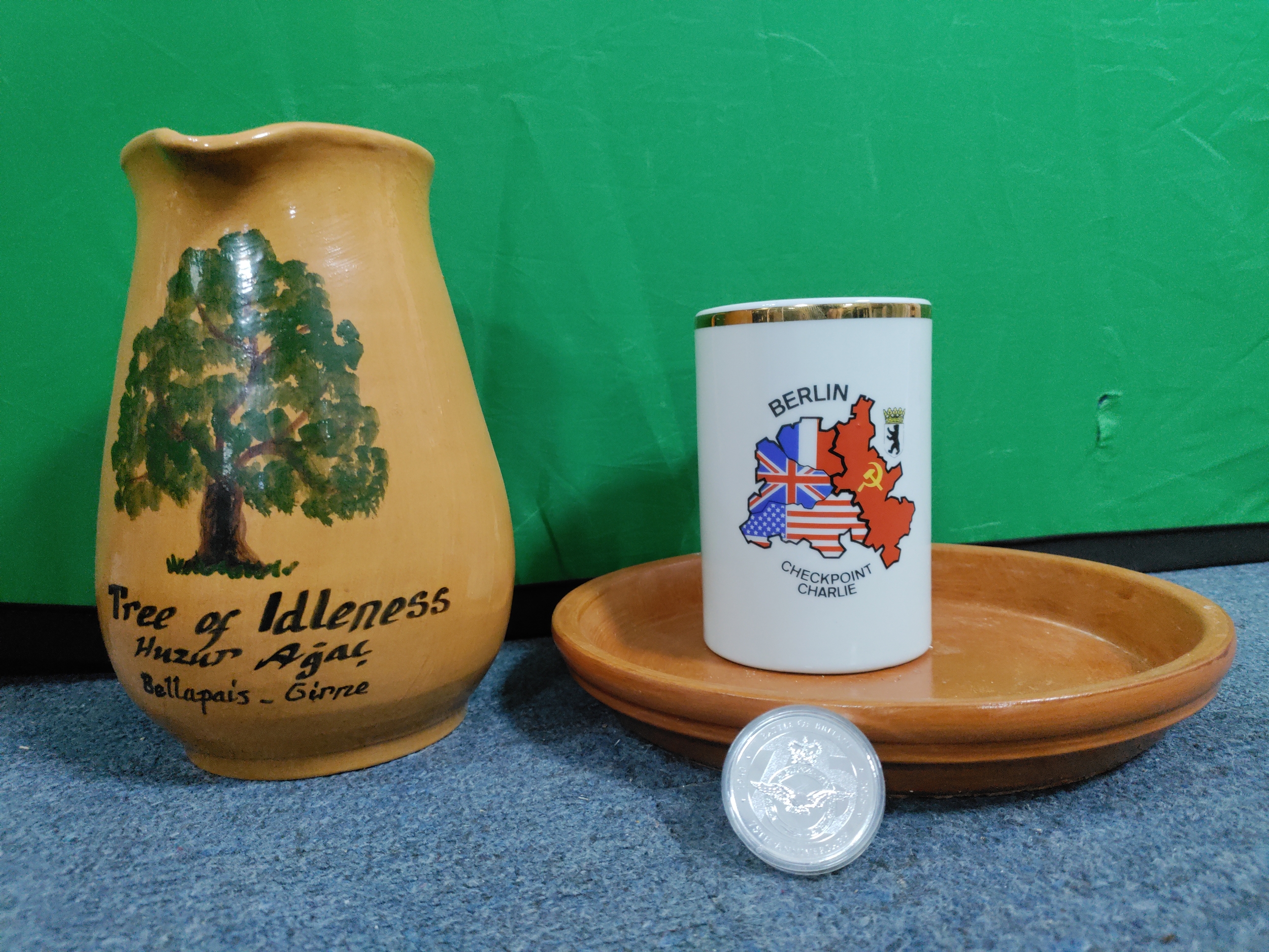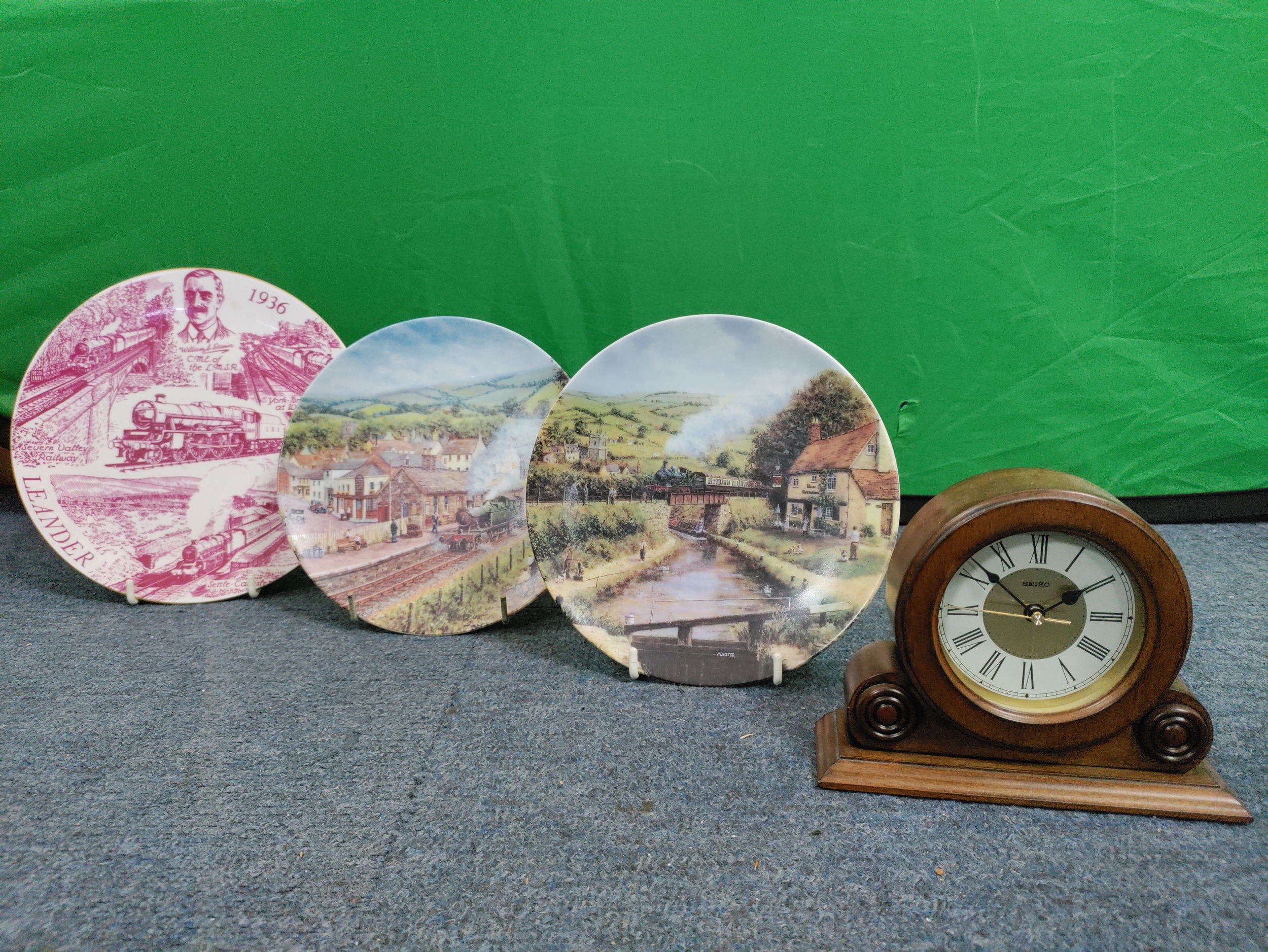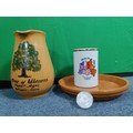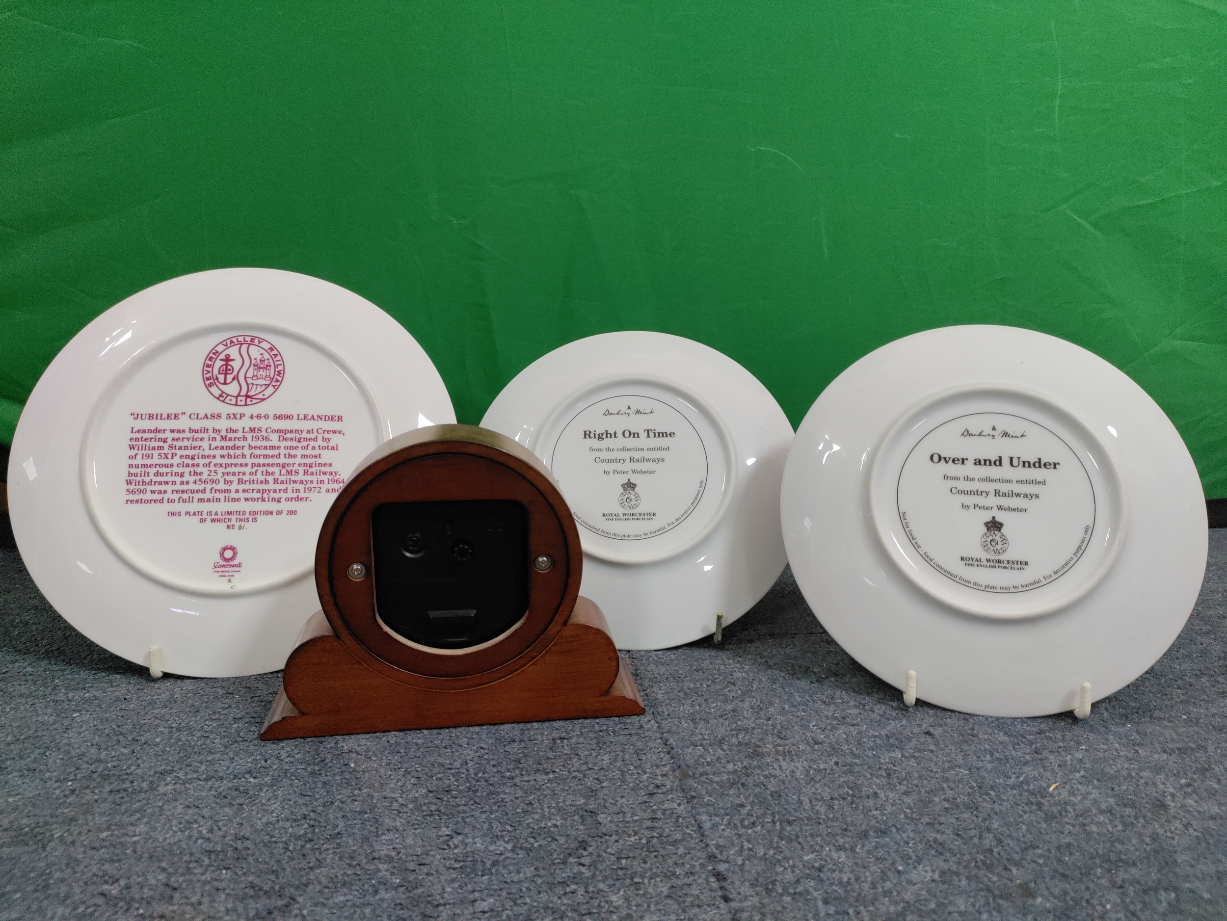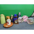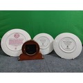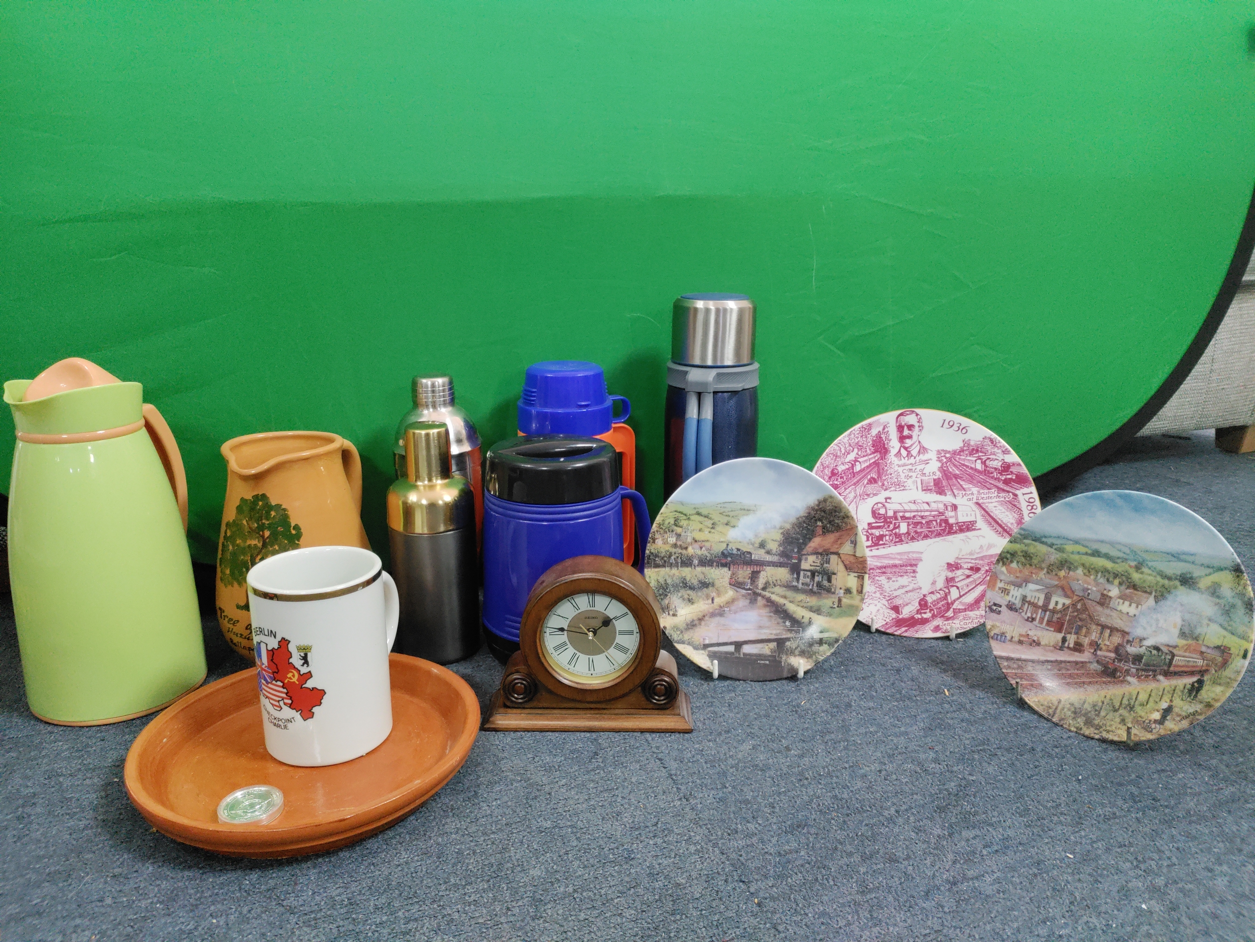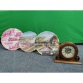 A collection of flasks, decanters and 2 Royal Worcester plates and a Laverswall fine china plate. To include a wooden clock, A 75th anniversary battle of Britain coin, a Berlin mug and a ceramic jug and plate.
