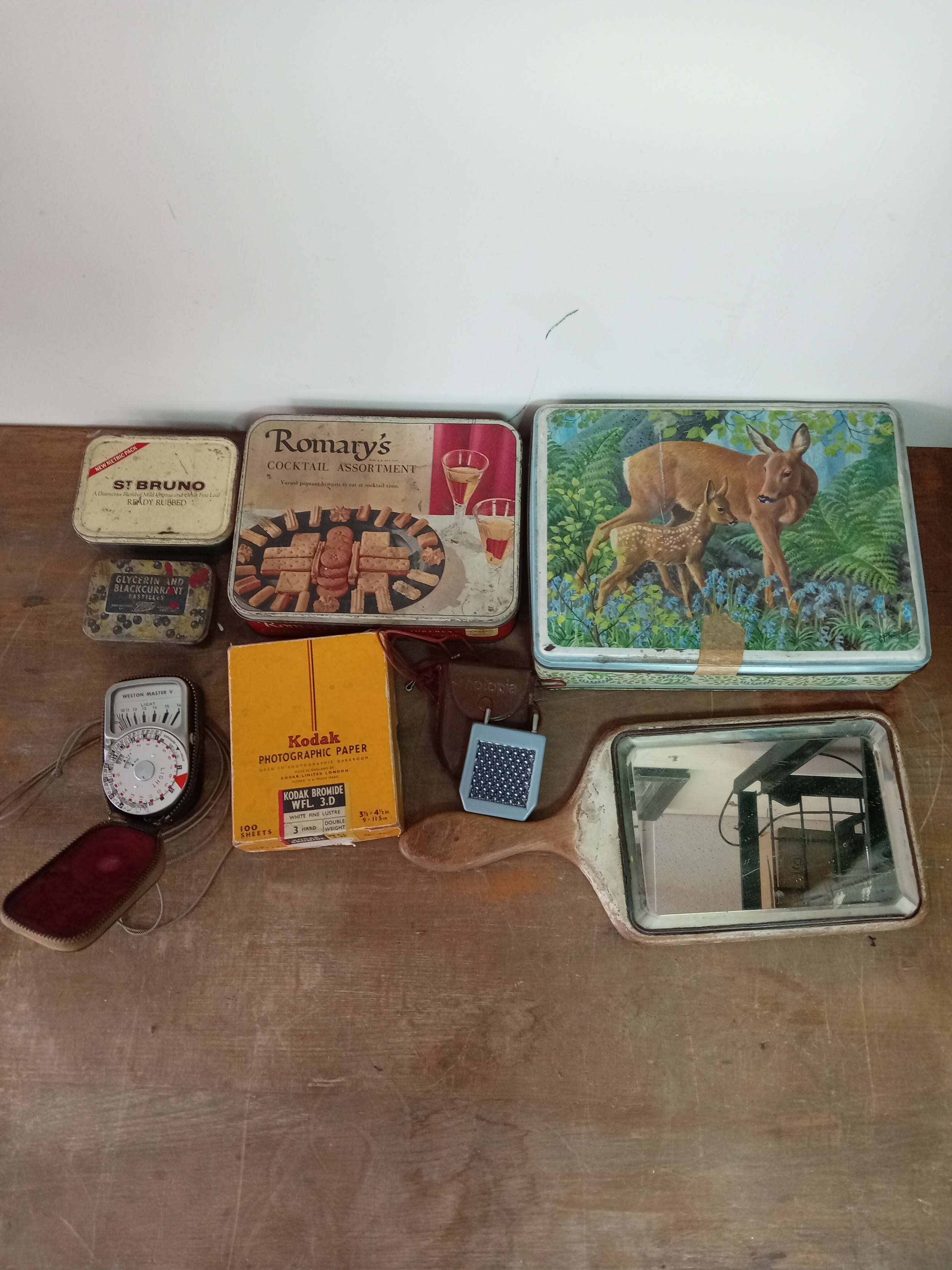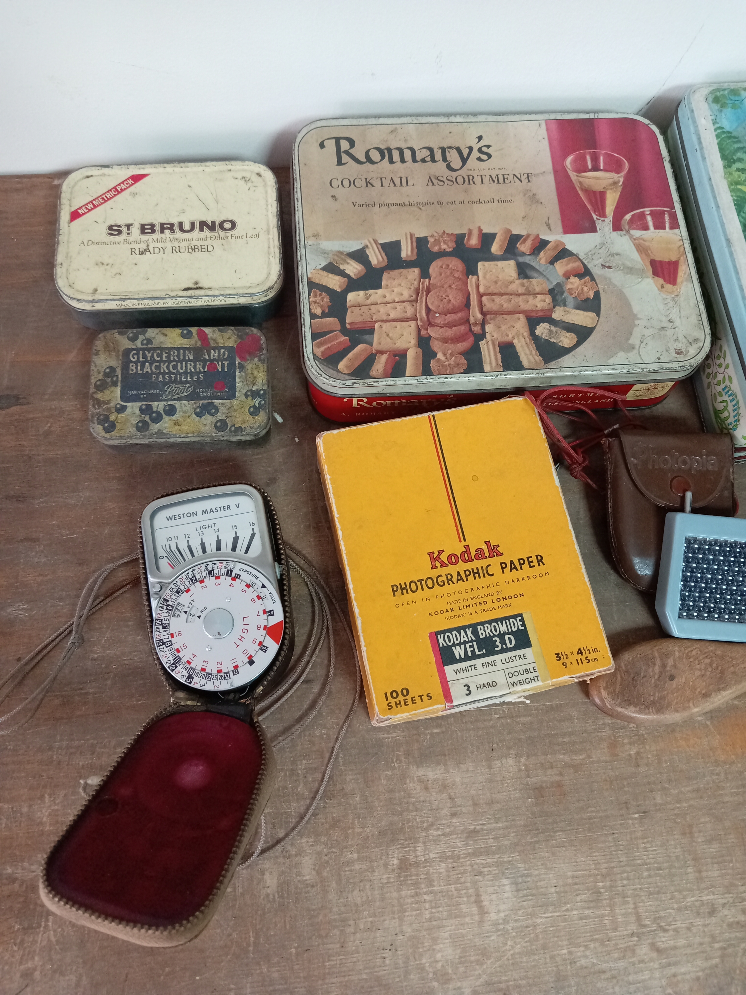 Assortment Of Vintage Empty Tins, Boxes & Weston Master V Exposure Meter With Case