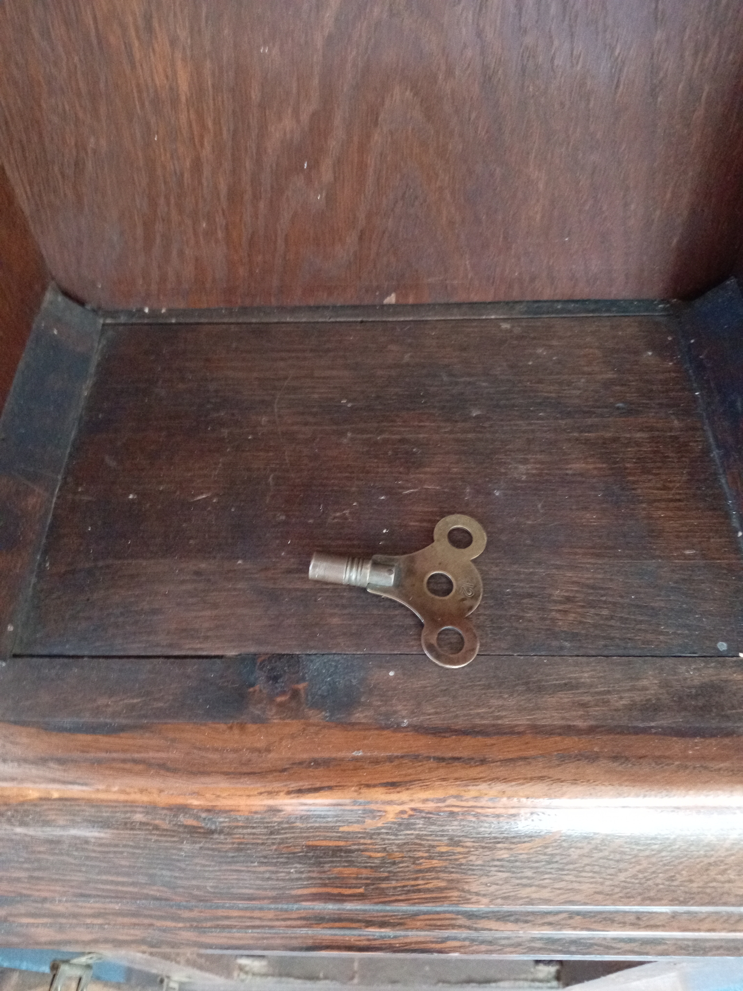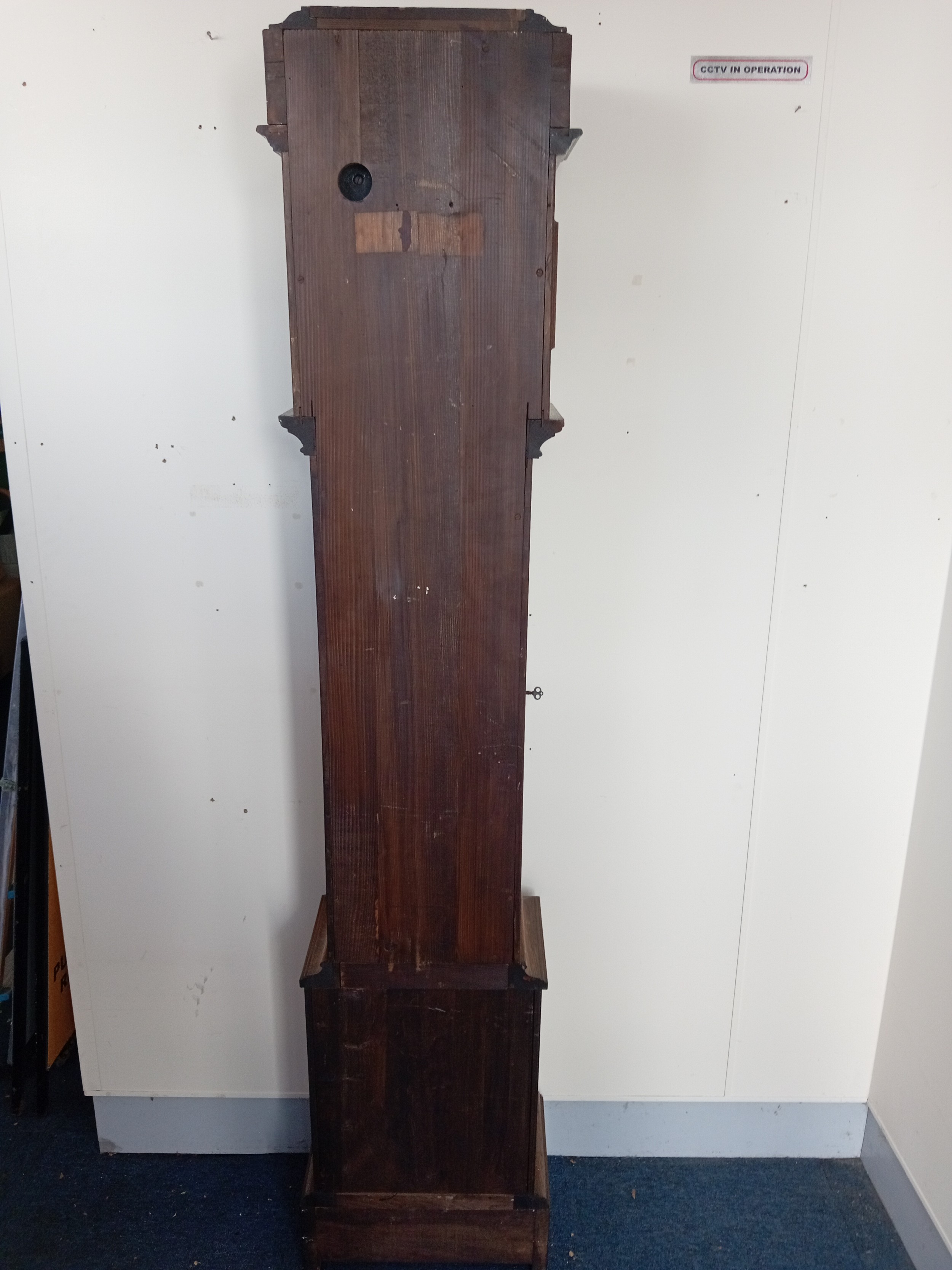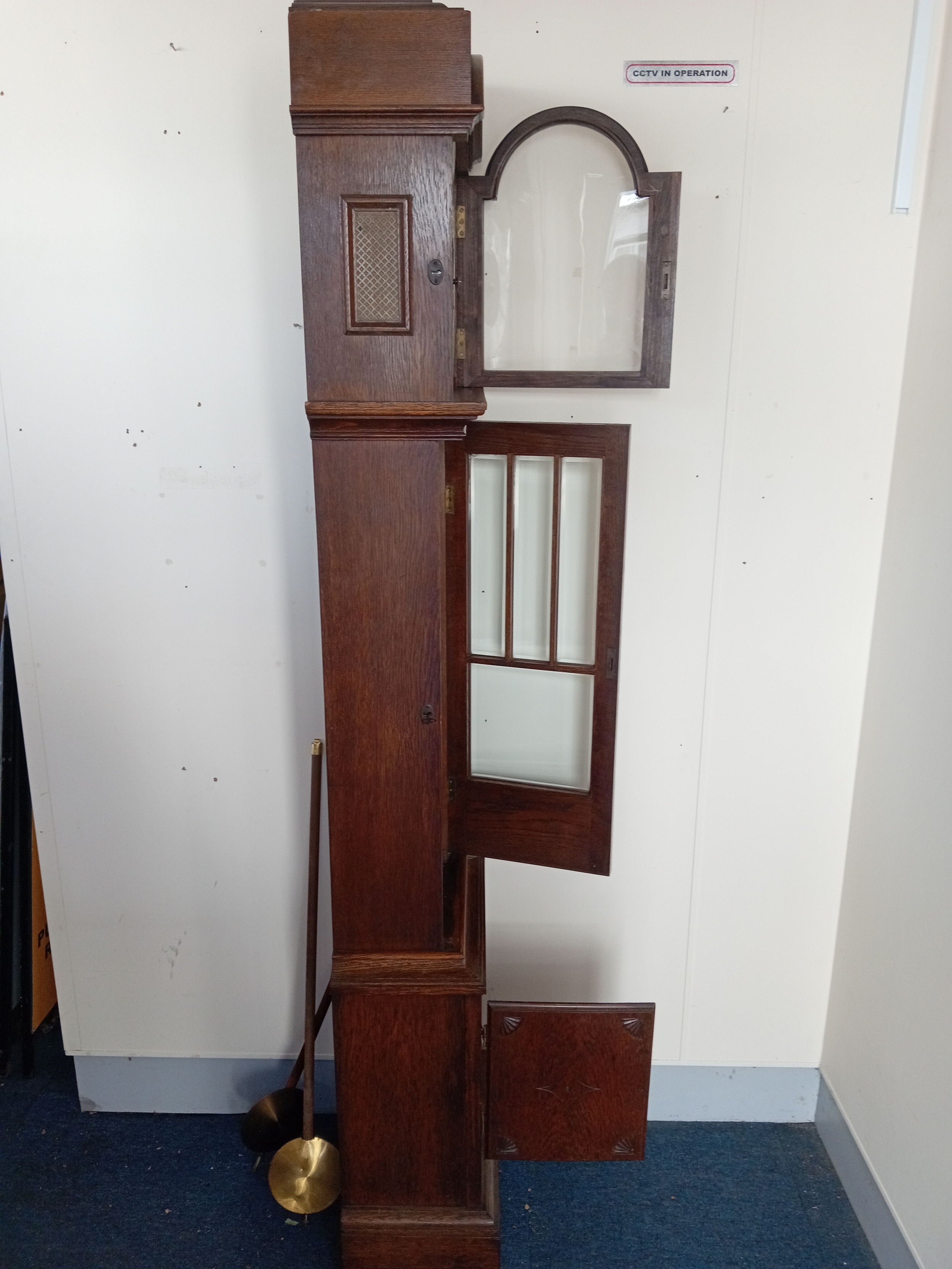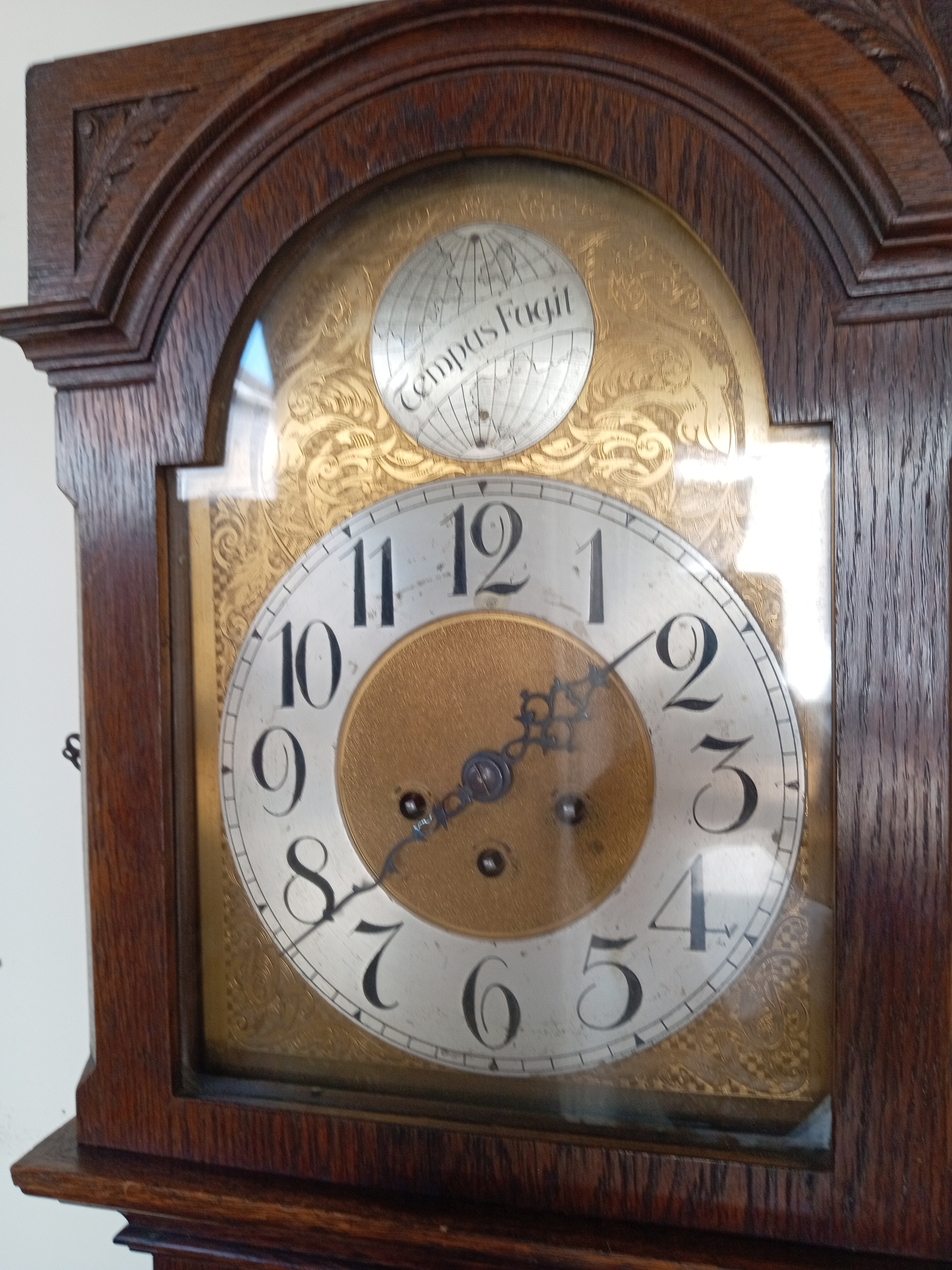 A Vintage "Tempus Fugit" Oak Cased Grand Mother 1/4 Hour Striking Clock with Door Key, Pendulum and Winding Key L 24 W 39 H 190